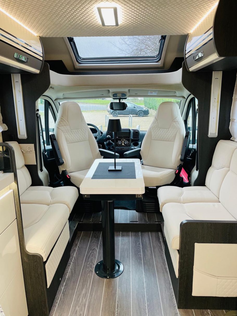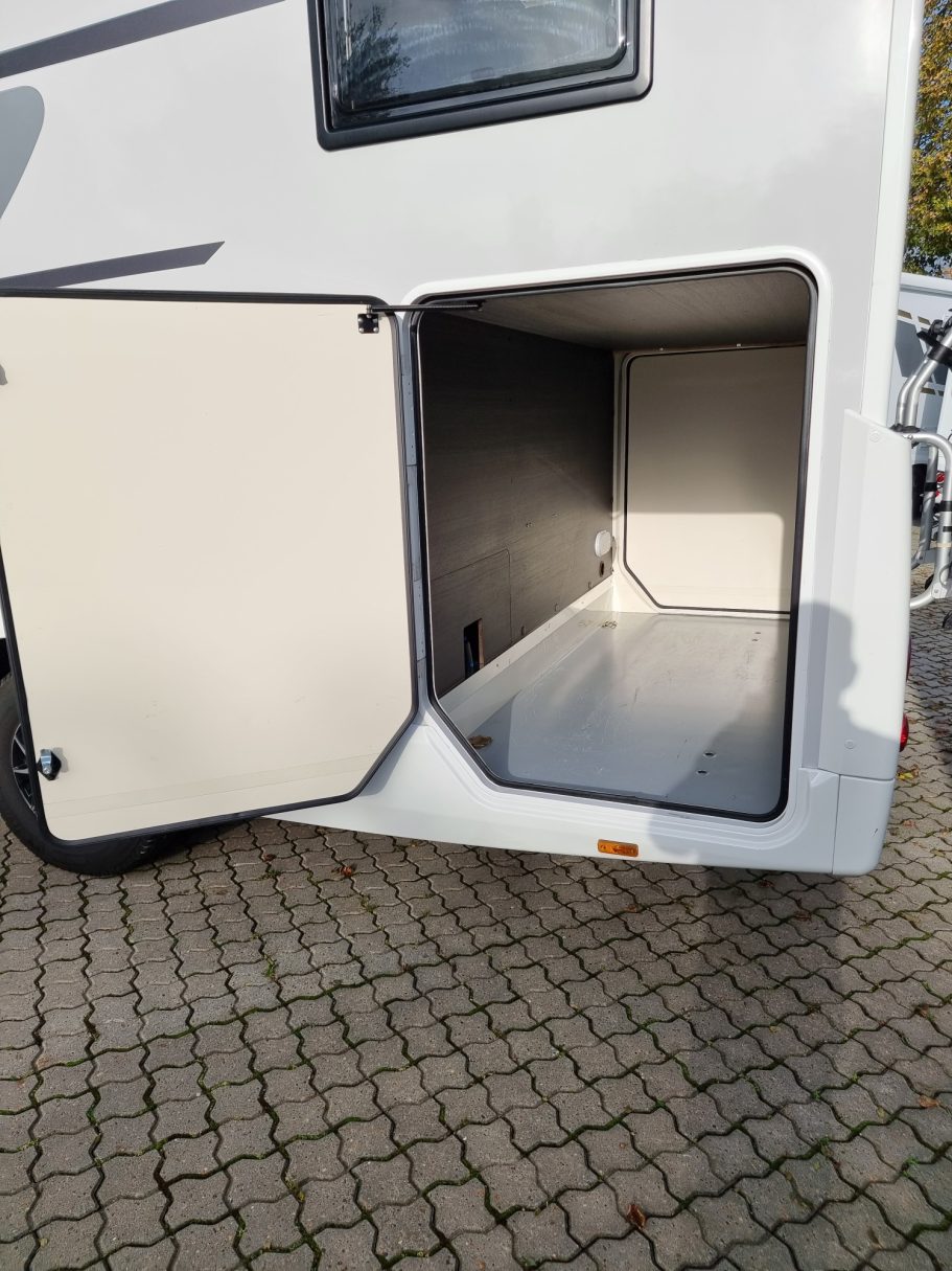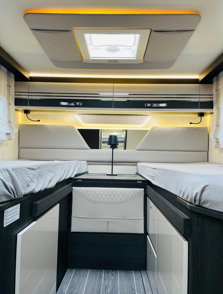 Unser teilintegriertes Schlafwerk 2.0 bietet durch das große Dachfenster ein beeindruckendes Raumgefühl. Es stehen insgesamt 4 Schlafplätze (Zwei Betten im Heck je 80x200 und ein Hubbett 128(107)x190) mit Absturzsicherung zur Verfügung.
