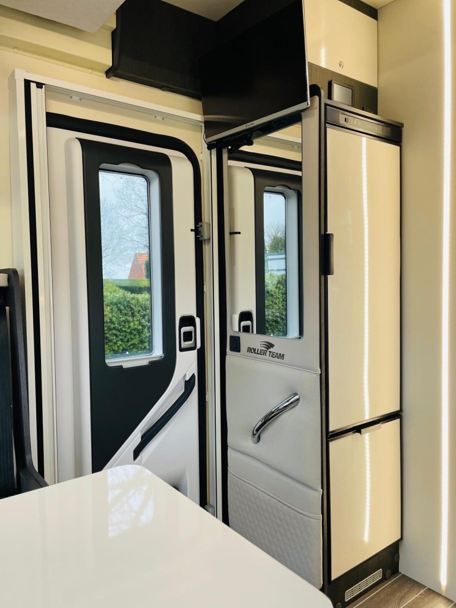 Ausgestattet ist das Schlafwerk mit einem großen Kühlschrank (betrieben mit Gas, 12V oder 230V) mit separater Flaschenschublade für kalte Getränke und einem Eisfach.