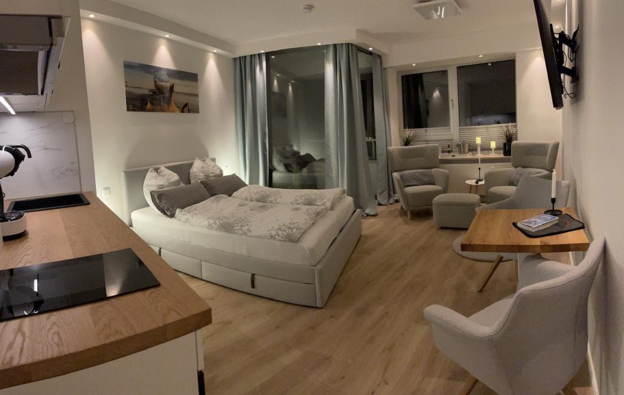 Unsere liebevoll eingerichtete Ferienwohnung im 5. Stock erwartet Euch herzlich mit einer Sitzecke zum Verweilen, einem bequemen Doppelbett und einer sehr gut eingerichteten Kochzeile. Von dem gemütlichen Balkon habt ihr einen herrlichen Blick auf einen der Schleihäfen. Um einen schönen Nachmittag oder Abend in Schleswig ausklingen zu lassen, befindet sich im 26. Stock eine Bar/Café mit beeindruckendem Panoramablick.